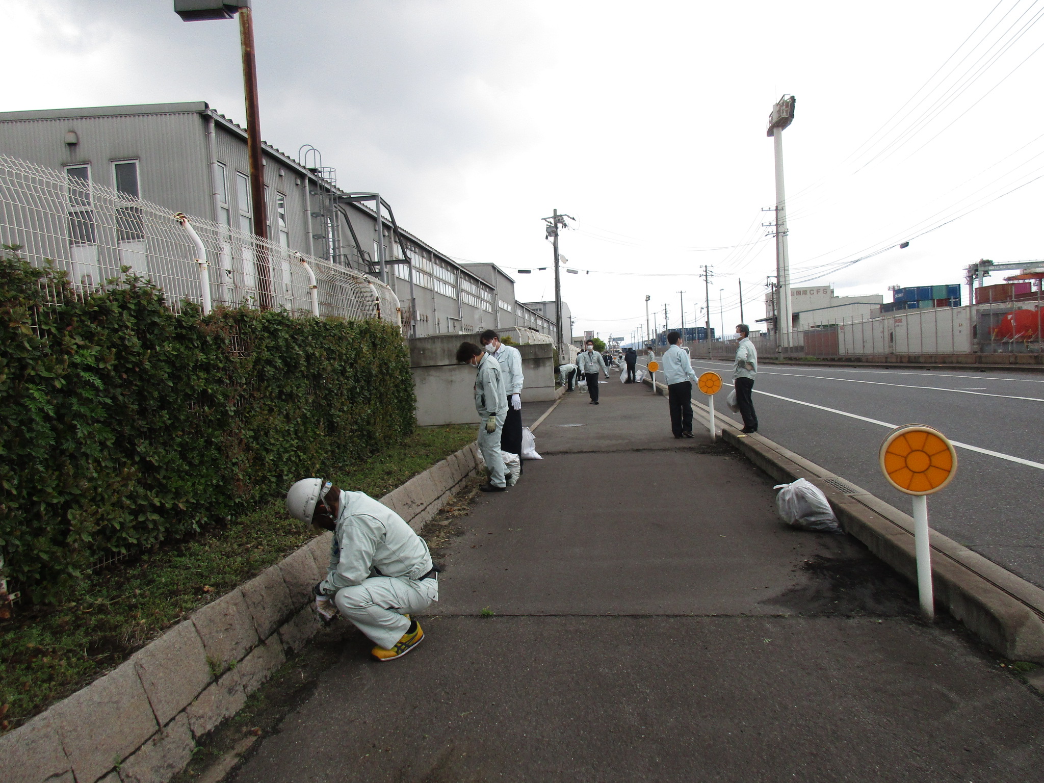 参加者は福山物流センター周辺の歩道などで雑草除去とゴミ拾い、泥の回収を行い、ビニール袋約40袋分、土嚢袋約20袋分の量を集めました。